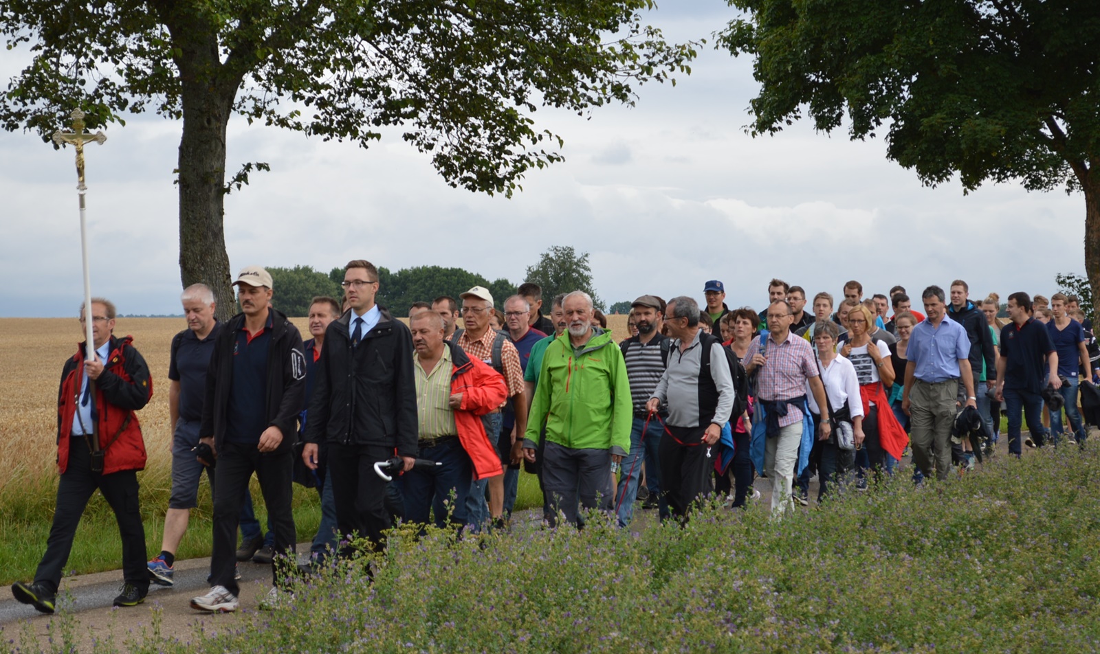 Die Erkertshofener Wallfahrer mit dem vorausgehenden Prozessions- und Wallfahrerkreuz auf ihrem Weg mit der Feuerwehrfahne zur Frauenbergkapelle nach Eichstätt, wo als Höhepunkt der Fußwallfahrt Monsignore Heinrich Weiß und Professor Ernst Reiter einen feierlichen Gottesdienst für alle verstorbenen Feuerwehrkameraden zelebrierte.