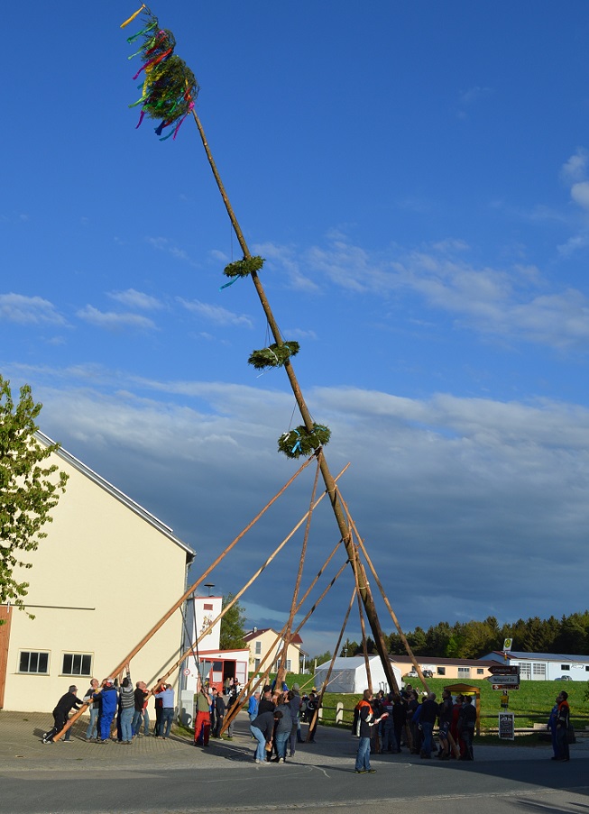 Traditionell am Tag vor dem 1. Mai wird in Erkertshofen am Dorfweiher ein Maibaum unter der Organisation von Landjugend und Freiwilliger Feuerwehr aufgestellt. Unter dem Kommando von Feuerwehrkommandant Simon Weiß wurde die knapp 30 Meter lange Fichte mit Muskelkraft an den dafür vorgesehenen Platz gehoben.
