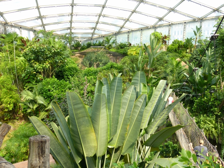 Hier leben unter einer überdachten freitragenden Stahlkonstruktion, mit einer Fläche größer als zwei Fußballfelder, 140 exotische Tierarten und rund 500 verschiedene Baum- und Pflanzenarten.