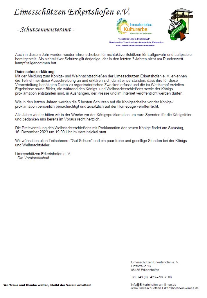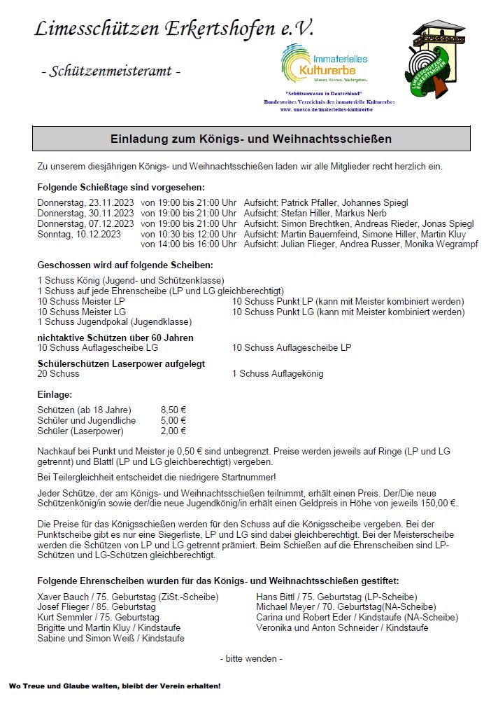 Beim diesjährigen Vereinsmeisterschießen der Limesschützen Erkertshofen war Simone Hiller in der Disziplin Luftgewehr nicht zu schlagen. Mit hervorragenden 485,02 Ringen sicherte sie sich nach einem spannenden Finalschießen den ersten Platz vor Peter Wegrampf (476,1) und Monika Wegrampf (475,3) und konnte so den Titel des Vereinsmeisters 2023 der Limesschützen Erkertshofen erringen. Den Vereinsmeistertitel mit der Luftpistole gewann Andras Rieder mit 460,8 Ringen gefolgt von Melanie Jörg (440,1) und Markus Nerb (438,7). Vereinsmeister bei Schülern mit dem Lichtgewehr wurde Ludwig Nerb mit 140 Ringen vor Hannah Habermeier (129) und Alexander Wegrampf (123)