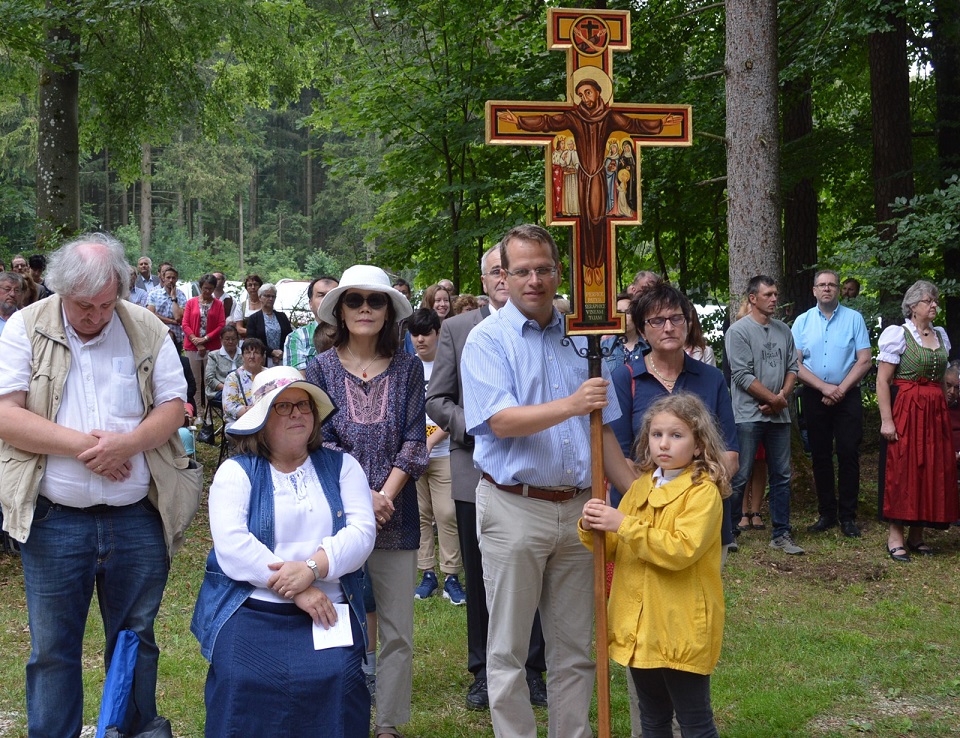 Weit über 1000 Antoniusverehrer aus Nah und Fern, darunter auch die Franziskanische Gemeinschaft aus Eichstätt, kamen am vergangenem Wochenende zur bekannten „Antoniuskapelle im Wald“ bei Erkertshofen, um das diesjährige Antoniusfest mitzufeiern. Bereits seit über 140 Jahren ziehen alle Jahre eine große Schar von Gläubigen und Antoniusverehrer, von der Pfarrkirche St. Ägidius in einer feierlichen Sakramentsprozession zur Antoniuskapelle, wo dann der Festgottesdienst zu Ehren des Heiligen stattfindet. Die Verehrung des Hl. Antonius von Padua, eines der beliebtesten Volksheiligen, des großen Predigers und Wundertäters, ist bis in diese Tage in der Pfarrei Erkertshofen ungebrochen. Nach der feierlichen Sakramentsprozession von der Pfarrkirche zur Antoniuskapelle im Wald konnte Ortspfarrer Johannes Trollmann den Leiter des Exerzitienreferates der Diözese Eichstätt, Dr. Michael Kleinert als Zelebrant und Festprediger begrüßen